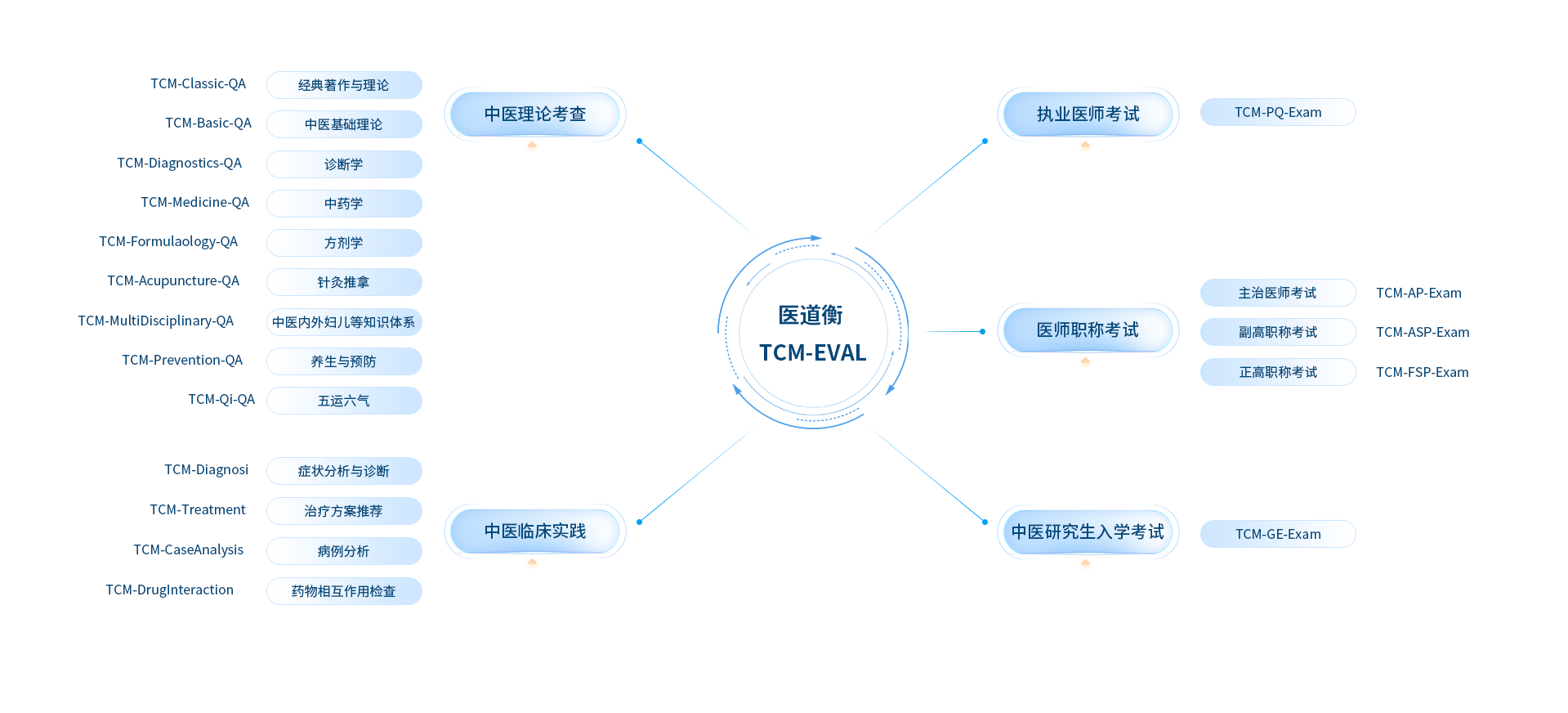 设置中医执业医师考试、中医医师职称考试、中医研究生入学考试、中医理论专题问答、中医临床实践等5大模块,共18个数据集。其中考试类数据集由权威中医专家团队根据国家医考大纲命题,中医理论问答数据集由权威中医专家团队根据中医专业教科书等通过国家认证的教材构建,中医临床实践数据集来源于真实病例并经过匿名化处理。